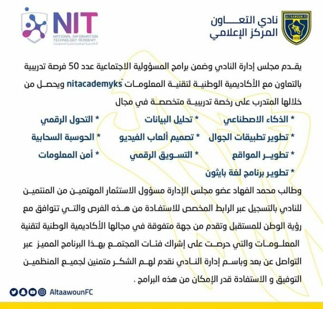 أطلق نادي التعاون السعودي مبادرة اجتماعية بالتعاون مع الأكاديمية الوطنية لتقنية المعلومات ، تهدف هذه المبادرة إلى تقديم 50 فرصة تدريبية لعدد من المجالات .
