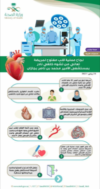 وأضافت أن الفريق الطبي قام - على الفور - بإجراء عملية قلب مفتوح للمريضة، وتبديل الصمام الذي يوجد به العيب الخلقي بصمام معدني، وتبديل الشريان الأورطي الصاعد بوصلة شريانية مصنعة مقاس 28 ملم، وبفضل الله كُللت العملية بالنجاح، وغادرت المريضة المستشفى وهي بصحة جيدة وحالتها مستقرة بفضل الله.